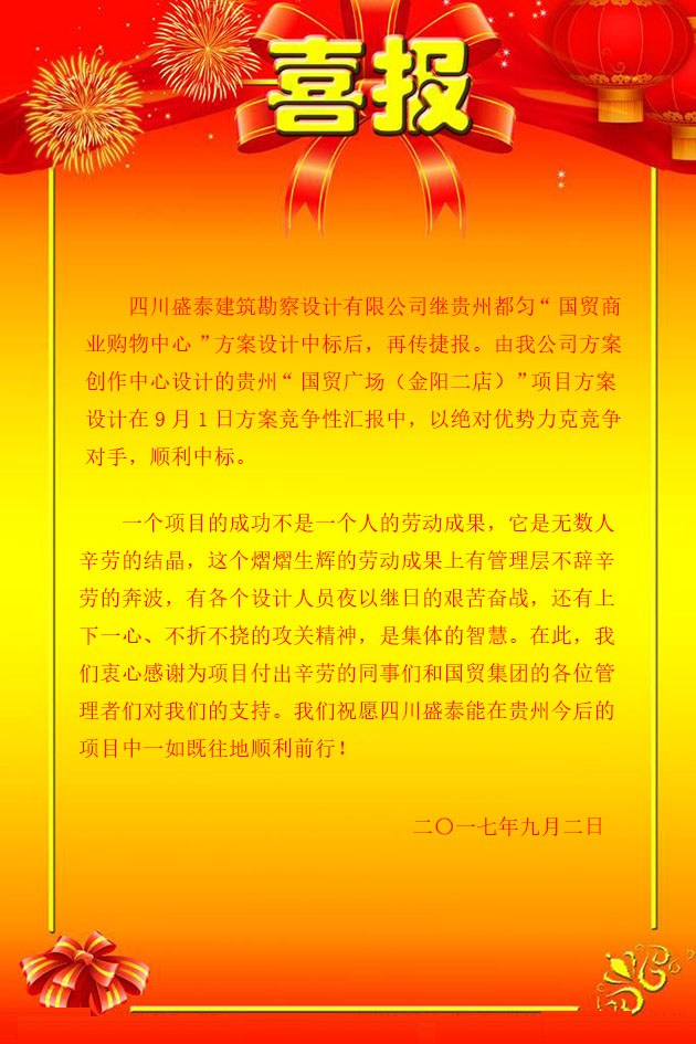 四川盛泰建筑勘察设计有限公司再传捷报,由我公司设计的贵州“国贸广场(