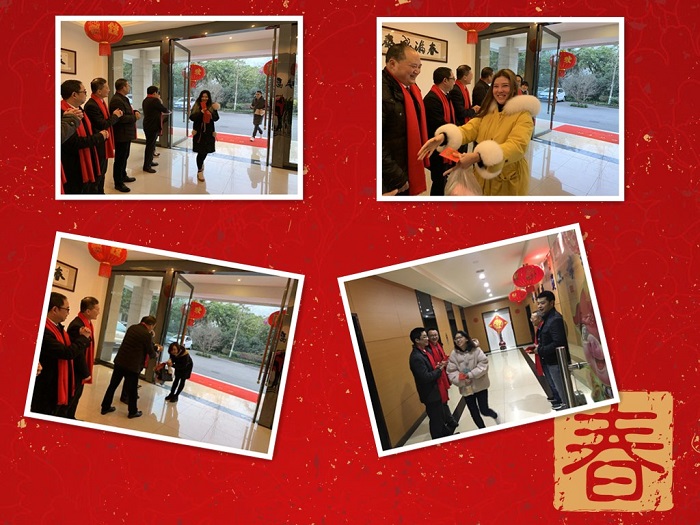 迎接大家的到来。手拿着红包满面笑容地送上一句句新年祝福“新年快乐、恭喜发财、大吉大利”,然后再